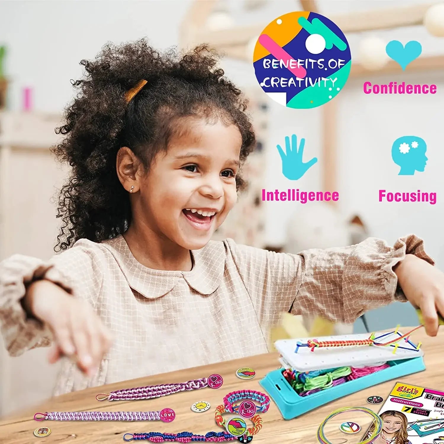 1.DIY Jewelry Making Kits for Girls: Includes 12 colors of bracelet threads,12 cartoon buckles, 1 bracelet loom and step by step instructions with illustrations to make 7 different styles of bracelets.